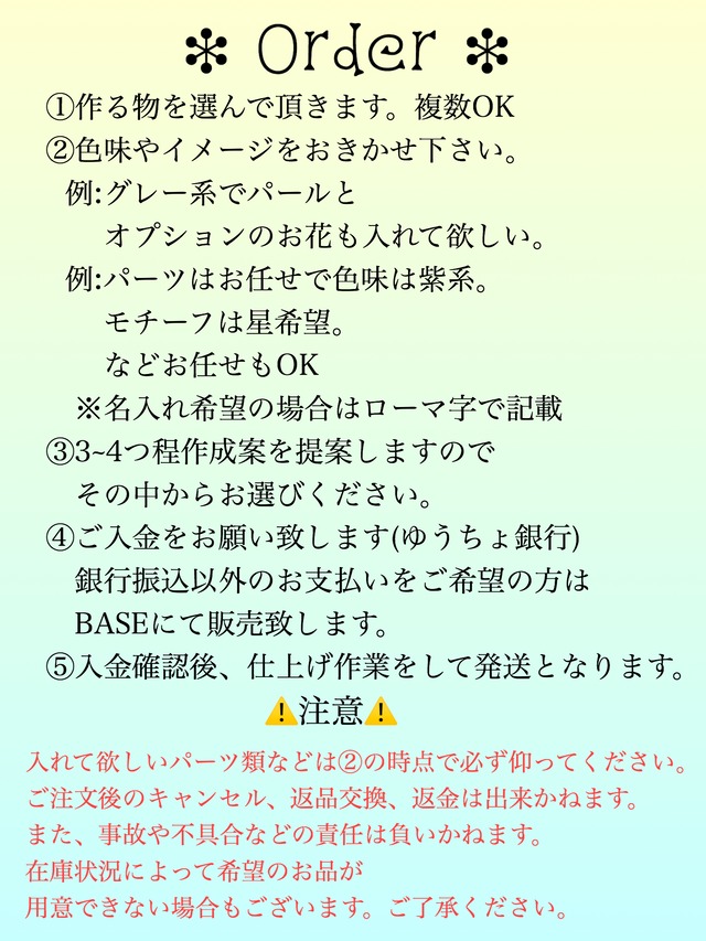 オーダー方法はフルオーダーの方法に基づいています。既製品と全く物で名入れや、色味違いなども可能ですので、気になった物があればご相談下さい♡ オーダーのお問い合わせ頂いて内容を伺いし、ご希望の物が完成しましたら専用出品させて頂きます♡