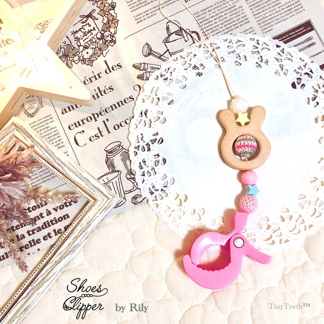ピンクのクリップにウサギのモチーフを間に入れた可愛い色合いのシューズクリッパーです❤️ 星のパーツも入っていてカラフルでPOPな仕上がりです.。◦♡ ❉ 使用しているパーツ FDA承認済、BPAフリーの食品グレードのパーツを使用しております。赤ちゃんがカミカミしてもご安心いただけます。 ❉ お手入れの仕方 ・シリコンパーツ OK:水洗い、煮沸 NG:電子レンジ、ミルトン等 シリコンパーツは水洗い可能なので、オールシリコンでお作りしたものは丸洗いOKです。 煮沸の場合10~15秒程熱湯の中に入れ菜箸等で取り出してください。熱いうちはシリコン独特のにおいがしますが、冷めるとにおいはなくなります。 ・ウッドパーツ 乾いた布やウェットティッシュなどで拭き取り、充分に乾かしてからご使用ください。 天然木から加工されたものを使用しております。形や色合いに多少の差があります。ご了承ください。 ❉ 接着剤・紐について 食品グレードの接着剤で赤ちゃんが口に入れても安心な物を使用しております。また、使用している紐は検査十分な強度があり、 ⚠️注意事項 お子様の安全のためにも必ず注意事項をお守りください。 ①ご使用の際は、必ず大人の目の届く場所でお願いいたします。お子様一人では使わないようにお願いいたします。 ◯定期的に紐が緩まっていないか、ウッドパーツやシリコンパーツの劣化による割れなどがないかご確認し、万が一紐が取れそうな場合は直ちに使用をやめてください。 《ご使用中の事故等には一切責任は負えませんのでご了承ください》