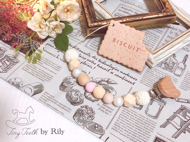 木の色合いとホワイトベースにナチュラルな色味になっております.。◦♡ 間のクマさんビーズも可愛いです\ ♪♪ / 写真のビスケット歯固めは本物みたいで思わず大人も食べたくなってしまうような可愛さです.。◦♡こちらはビスケット付きのお値段になっていますが無しでも販売可能です。また、他のおもちゃホルダーにビスケットを希望の方はオプションになっていますのでオーダーの際に仰ってください✩.*˚
