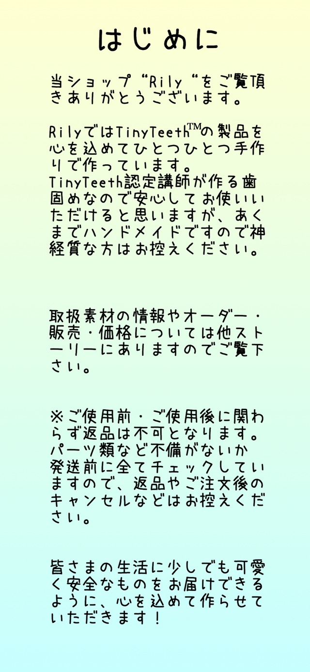 画像に注意事項や詳細がありますので、ご購入前に必ずお読み下さい(*´`) ❉ 使用しているパーツ FDA承認済、BPAフリーの食品グレードのパーツを使用しております。赤ちゃんがカミカミしてもご安心いただけます。 ❉ お手入れの仕方 ・シリコンパーツ OK:水洗い、煮沸 NG:電子レンジ、ミルトン等 シリコンパーツは水洗い可能なので、オールシリコンでお作りしたものは丸洗いOKです。 煮沸の場合10~15秒程熱湯の中に入れ菜箸等で取り出してください。熱いうちはシリコン独特のにおいがしますが、冷めるとにおいはなくなります。 ・ウッドパーツ 乾いた布やウェットティッシュなどで拭き取り、充分に乾かしてからご使用ください。 天然木から加工されたものを使用しております。形や色合いに多少の差があります。ご了承ください。 ❉ 接着剤・紐について 食品グレードの接着剤で赤ちゃんが口に入れても安心な物を使用しております。また、使用している紐は検査十分な強度があり、 ⚠️注意事項 お子様の安全のためにも必ず注意事項をお守りください。 ①ご使用の際は、必ず大人の目の届く場所でお願いいたします。お子様一人では使わないようにお願いいたします。 ◯定期的に紐が緩まっていないか、ウッドパーツやシリコンパーツの劣化による割れなどがないかご確認し、万が一紐が取れそうな場合は直ちに使用をやめてください。 《ご使用中の事故等には一切責任は負えませんのでご了承ください》