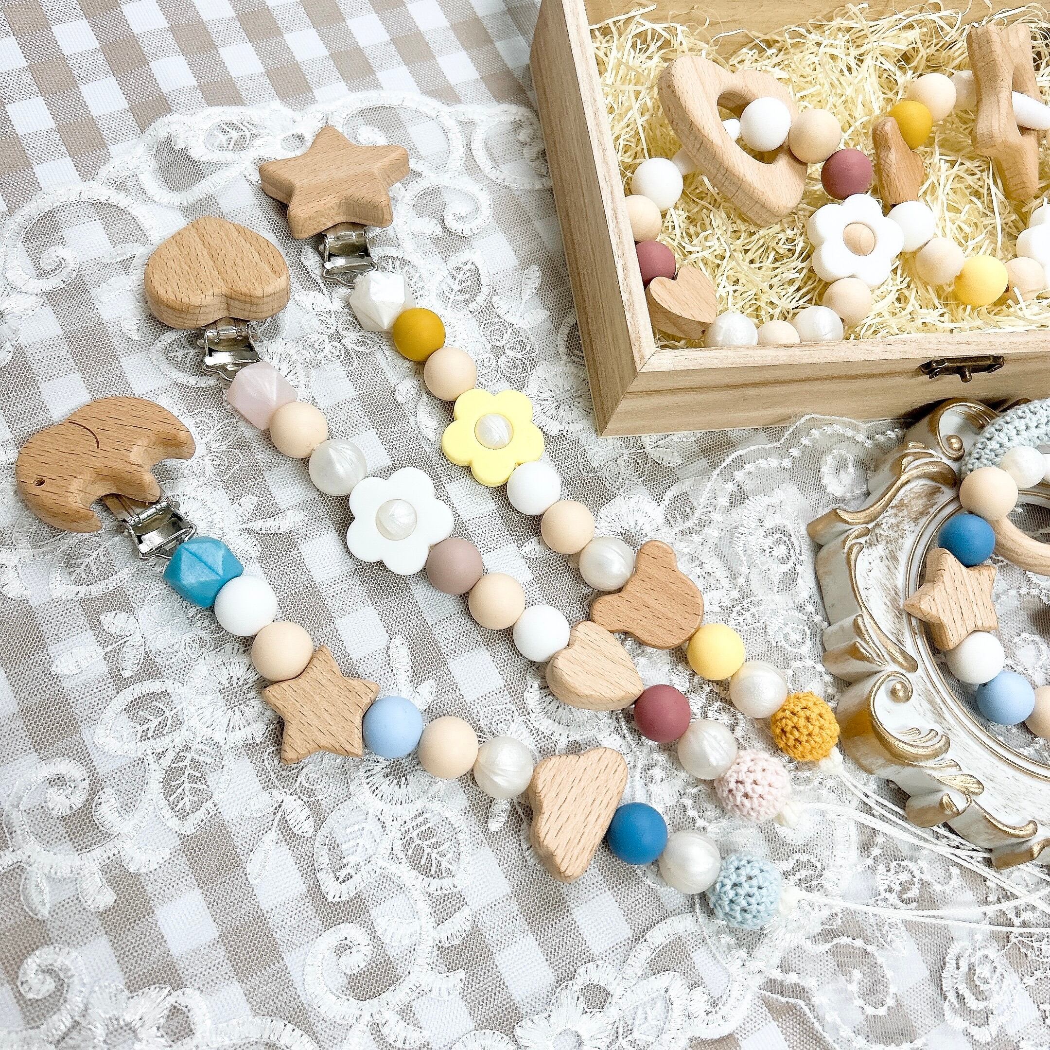 木製モチーフ変更可能! おもちゃホルダーとしてのご利用はもちろん、おしゃぶりホルダーとしてもお使いいただけます。 こちらは茶×ボルドーの色合いでお作りしています。クリップの部分はオプションの星型を使用していますが、他にもノーマルの丸型や、丸型クマ、シリコンカラーの取り扱いもございますので、詳しくは商品一覧をご覧下さい。 茶×ピンクなど他の色合いでもお作り出来ますので、お気軽にオーダーお問い合わせ下さい(*´`) FDA承認済、BPAフリーの素材を使っていますので、赤ちゃんにも安心してカミカミいただけます。
