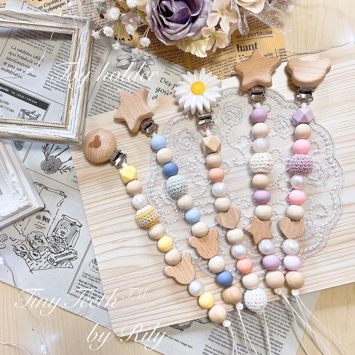 可愛さ溢れるベビークリップ、シューズクリッパーです!赤ちゃんの小さな靴をしっかりと固定しつつ、見た目も楽しめるデザインになっています✨ ❉ 使用しているパーツ FDA承認済、BPAフリーの食品グレードのパーツを使用しております。安全性を重視しており、赤ちゃんが口に入れても安心です。 ❉ お手入れの仕方 ・シリコンパーツ OK:水洗い、煮沸 NG:電子レンジ、ミルトン等 シリコンパーツは水洗い可能なので、簡単にお手入れができます。煮沸する際は、10~15秒程熱湯に入れてから取り出してください。一時的にシリコン独特のにおいがすることがありますが、冷めると消えます。 ・ウッドパーツ 乾いた布やウェットティッシュで拭き取り、十分に乾燥させてからご使用ください。天然木を使用しているため、形や色に多少の差異があることをご了承ください。 ❉ 接着剤・紐について 食品グレードの接着剤を使用しており、赤ちゃんが安全に使えるよう配慮されています。使用している紐も十分な強度が確認済みです。 ⚠️ 注意事項 赤ちゃんの安全のため、必ず以下の注意事項をお守りください。 ①ご使用の際は、必ず大人の目の届く場所でお願いいたします。お子様一人では使用しないようにお願いいたします。 ◯定期的にクリップの状態を確認し、もし異常があった場合は即座に使用を中止してください。 《ご使用中の事故等には一切責任は負えませんのでご了承ください》 赤ちゃんの可愛らしさを引き立てるシューズクリッパーをぜひお試しください!