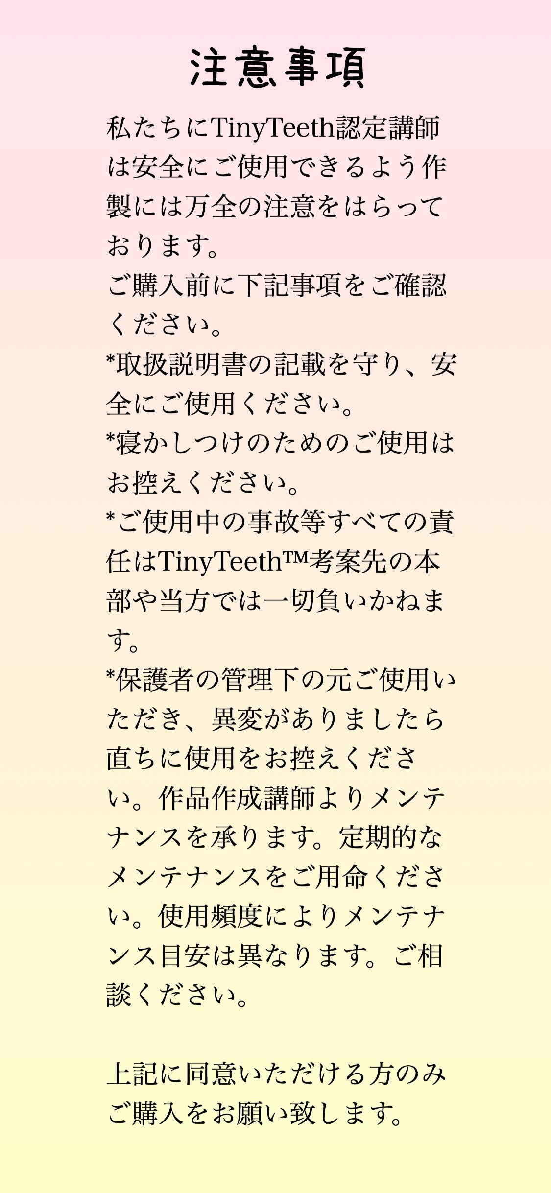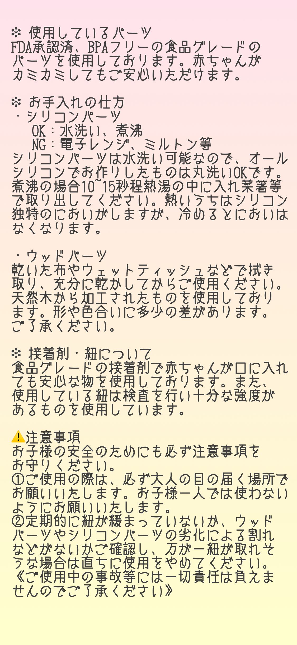 ◯定期的に紐が緩まっていないか、ウッドパーツやシリコンパーツの劣化による割れなどがないかご確認し、万が一紐が取れそうな場合は直ちに使用をやめてください。
